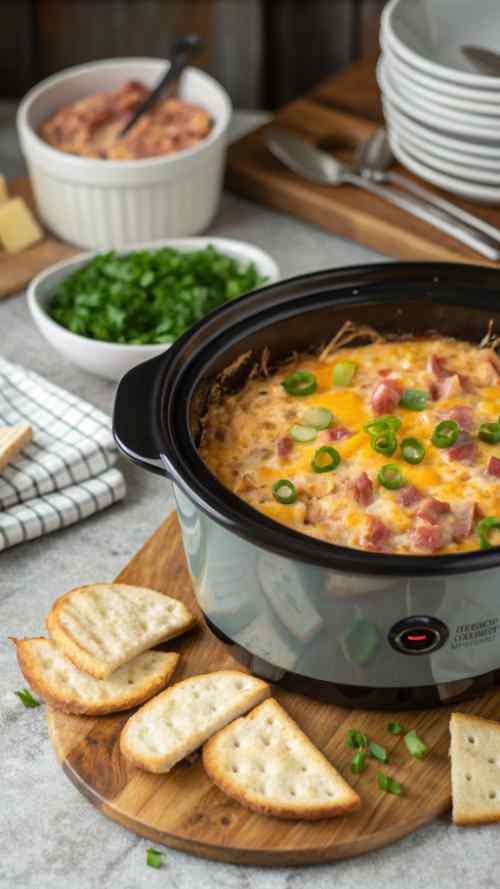 - In the Crockpot, combine turkey ham, cheddar cheese, cream cheese, mayonnaise, Dijon mustard, and green onions.