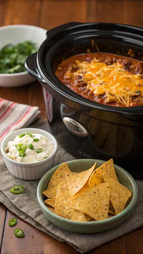 - In the Crockpot, combine chili, cream cheese, cheddar cheese, and sour cream.
