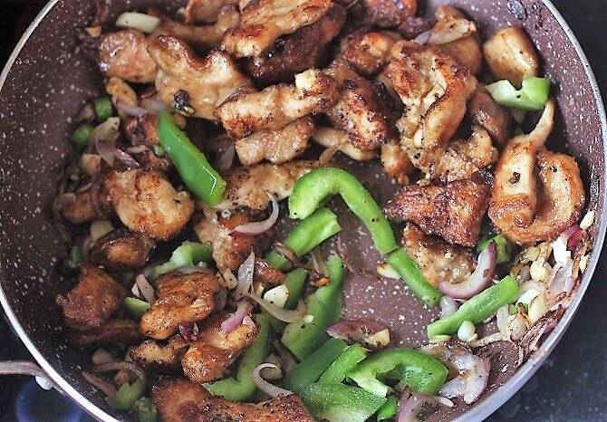 - Add the green capsicum and fried chicken pieces. Saute for further couple of minutes.