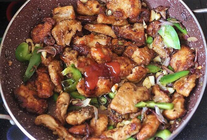 - Toss in the green capsicum and fried chicken pieces and cook for a couple of minutes.
