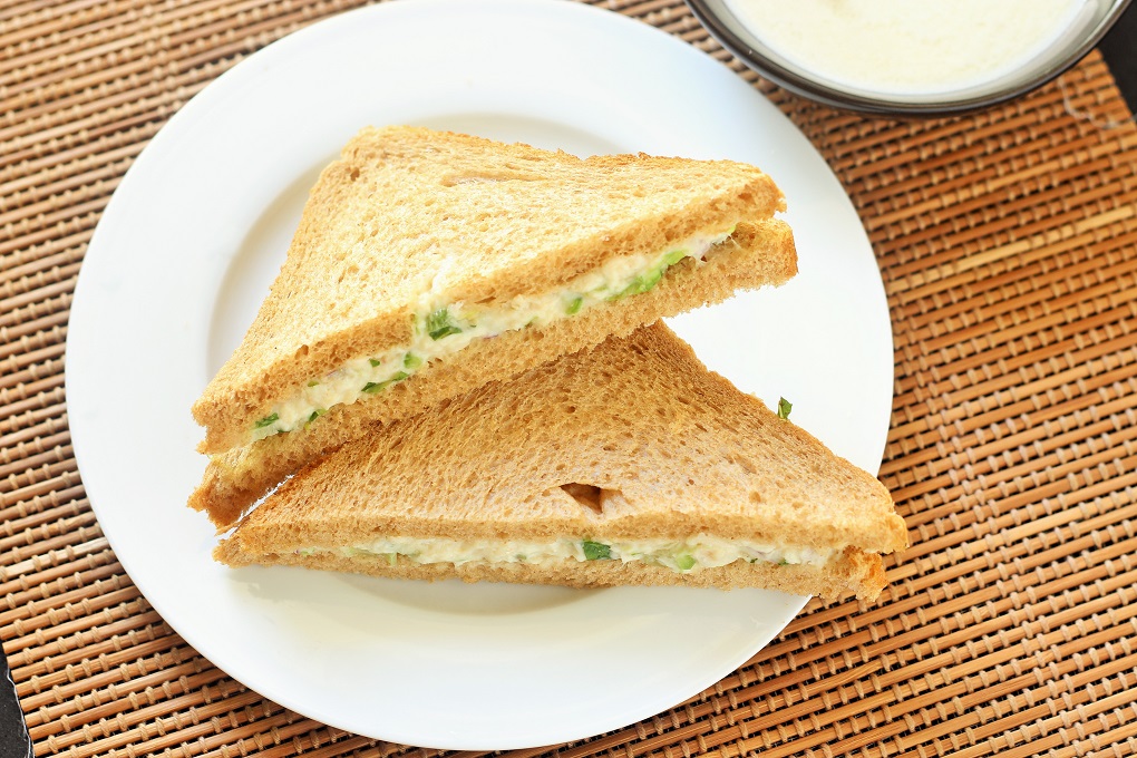 - Spread the prepared mixture on 4 brown bread slices. Top with remaining bread. Serve immediately.