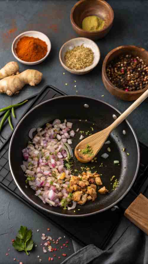 - Add garlic, ginger, and green chili. Stir for 30 seconds.