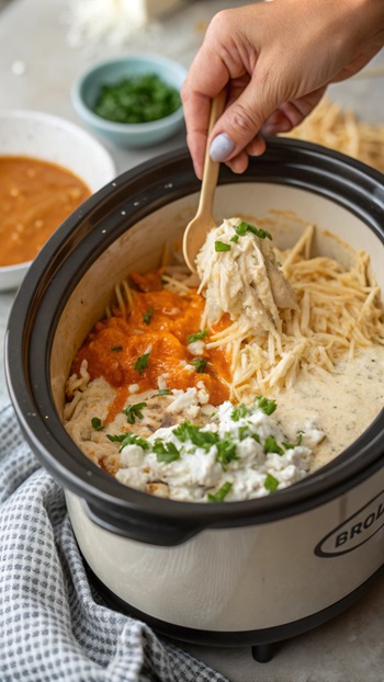 - Add Everything to the Crockpot: Once your chicken is ready, it’s time to get everything into the Crockpot. Add the shredded chicken, 8 oz of softened cream cheese, 1/2 cup of ranch dressing (or blue cheese if you like it), 1/2 cup of buffalo sauce, and both shredded cheddar and mozzarella cheeses. It might look like a lot, but trust me, it all blends together perfectly.