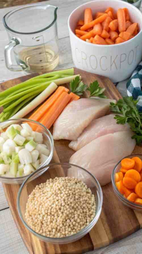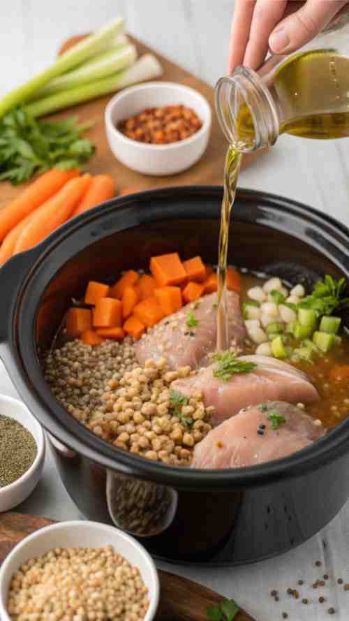 Now for the fun part. Once your veggies are chopped, toss them into the crockpot. Then, grab your chicken breasts (or thighs) and plop them on top of the veggies. No need to chop them up yet—we’ll do that later. Add the barley, thyme, rosemary, bay leaf, and a pinch of salt and pepper.