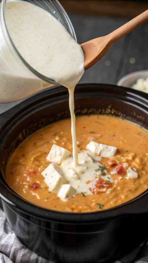 - Stir in cream cheese and half & half. Cook on HIGH for another 10–15 minutes, stirring until everything’s melted and smooth.