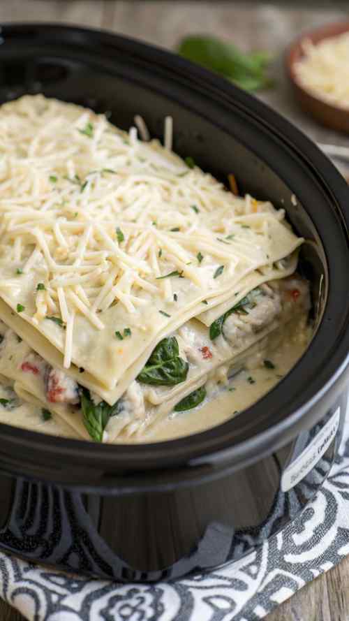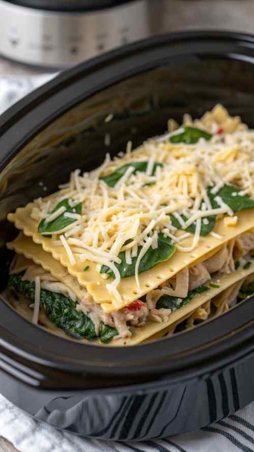 Step 4: Start Layering the Lasagna Here’s where it gets fun. Spread a little bit of that creamy sauce at the bottom of the crockpot. Then, lay down a layer of uncooked lasagna noodles on top. No-boil noodles are magic, I tell ya. After that, add a layer of shredded chicken, a handful of spinach (don’t be shy, it wilts down!), and a spoonful of your cheesy mixture. Repeat this until you’ve used up all your ingredients. I usually end with a big layer of cheese on top because, well, more cheese is always better.