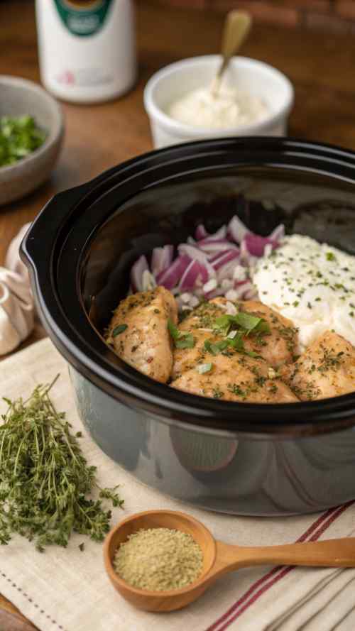 Step 1: Prep the Chicken First, get your crockpot ready. Place the chicken breasts in there. Toss in the chopped onion, minced garlic, basil, oregano, salt, and pepper. Pour the chicken broth and heavy cream over everything. Give it a little stir. Then, cover it up and cook on low for about 4 hours. When the chicken’s done, it should be all juicy and tender – that’s when you know it’s ready for the next step.