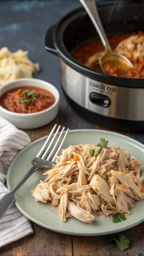 - Remove the chicken from the slow cooker and shred it with two forks. Return the shredded chicken to the crockpot and mix it with the sauce.