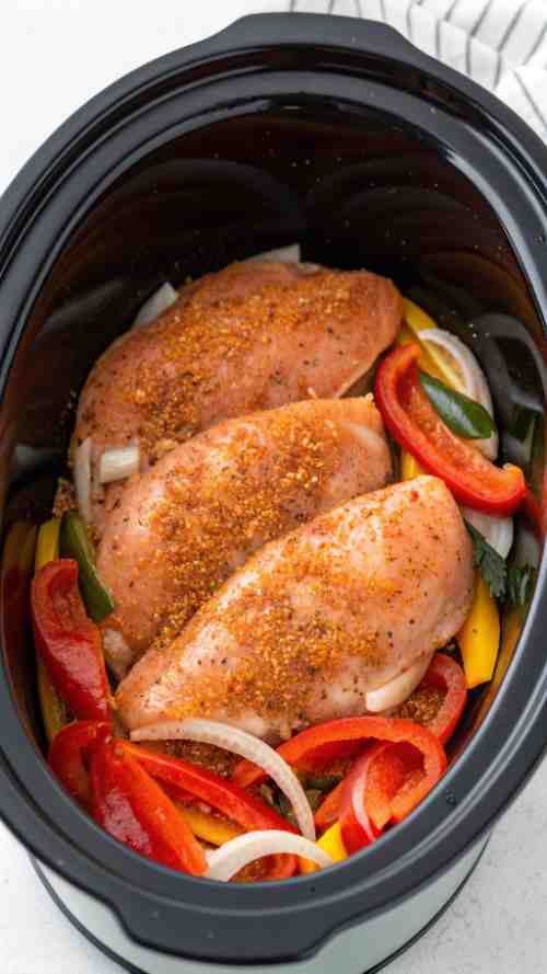 Place the sliced peppers and onion in the bottom of the crockpot. This makes a nice little bed for the chicken to cook on.