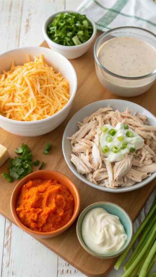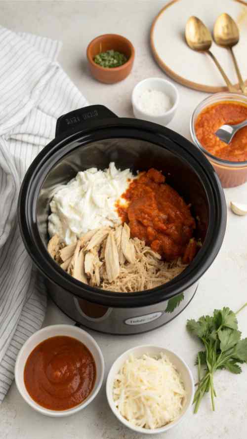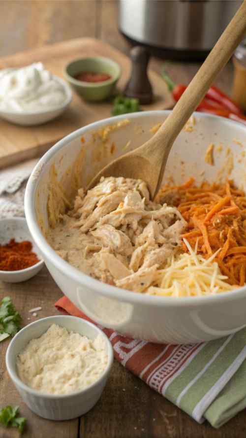 Now, grab your trusty crockpot (the real MVP of busy moms, am I right?). Dump in the shredded chicken, softened cream cheese, ranch dressing, and buffalo wing sauce. Stir it all up. It’s gonna look a little thick, but that’s okay!