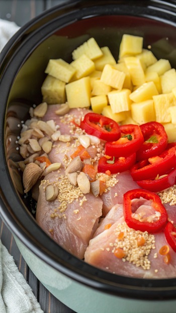 - Place chicken tenderloins at the bottom of the crockpot. Add garlic, ginger, pineapple chunks, and optional bell pepper on top.