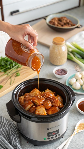 - In a small bowl, whisk together honey, soy sauce, ketchup, garlic, rice vinegar, and sesame oil. Pour the sauce over the chicken, ensuring it’s evenly coated.