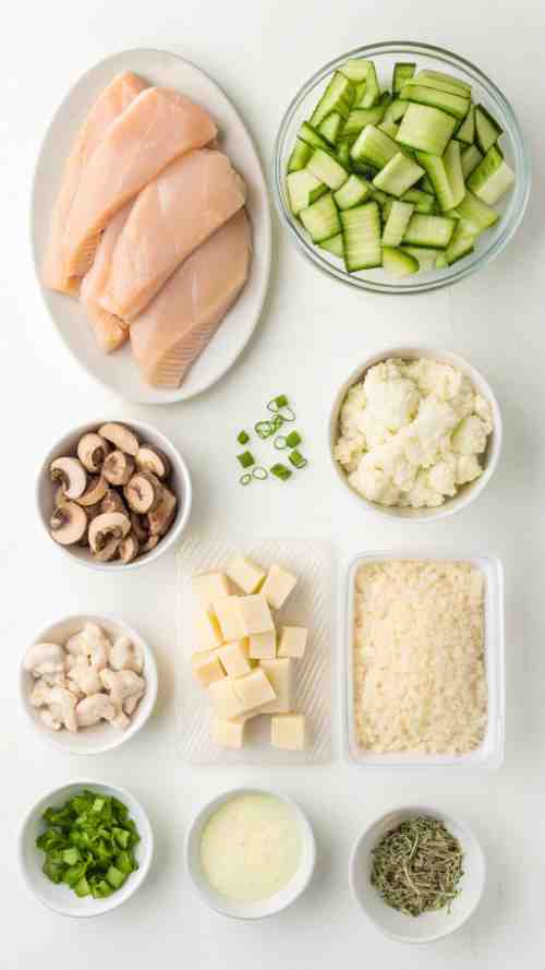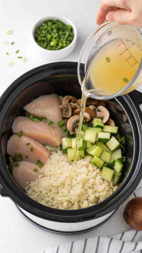 Place the chicken, broth, cauliflower, celery, zucchini, onion, garlic, and all the seasonings into your crockpot. Give it a quick stir.