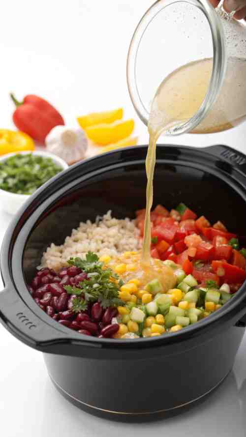 - Place rice, beans, corn, onion, garlic, bell pepper, tomatoes, and spices into the crockpot. Pour in broth and stir gently.