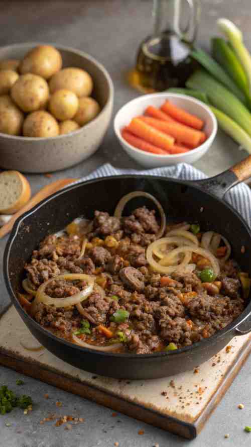 - In a skillet, brown the ground beef with the chopped onion over medium heat. Drain any excess fat and transfer it to the Crockpot.