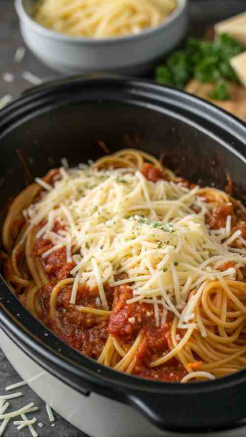 - About 10 minutes before it’s done, sprinkle shredded cheese over the top. Let it melt into the spaghetti.