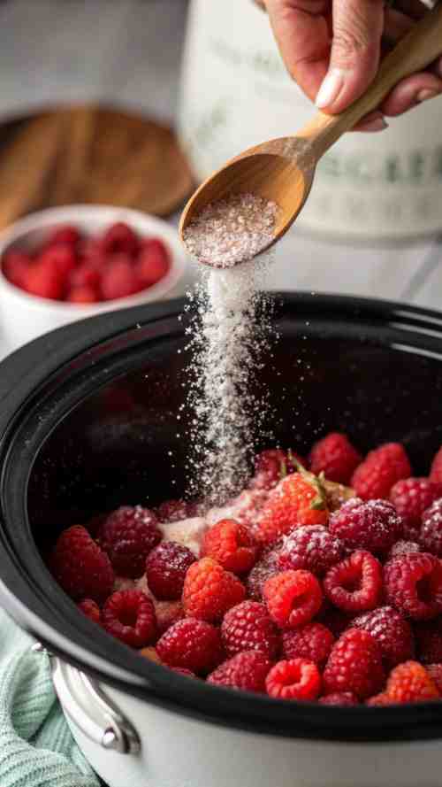 - Add raspberries to the crockpot. Sprinkle ¼ cup sugar and vanilla extract over them. Stir gently.