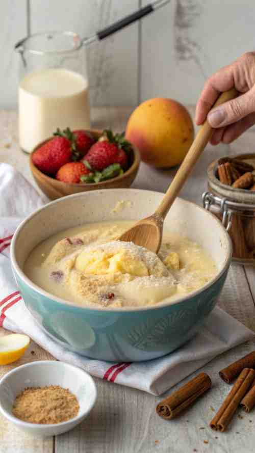 In a mixing bowl, combine the cake mix, remaining ½ cup of sugar, cinnamon, melted butter, and milk. Stir until it forms a thick batter. Don’t overthink it—it’s cobbler, not a science experiment.