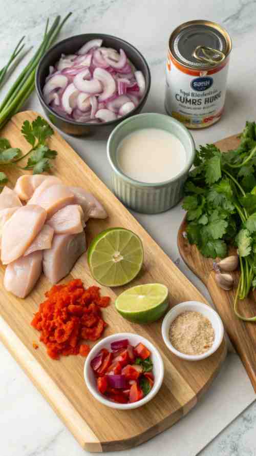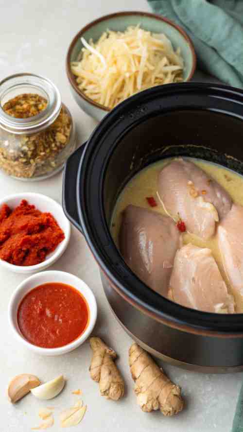 Now, pour in that glorious coconut milk and chicken broth. Add the chopped onion, minced garlic, ginger, red curry paste, fish sauce, and brown sugar. It might look like a lot of ingredients, but trust me, it all comes together. Stir it up a little, and you’re good to go.