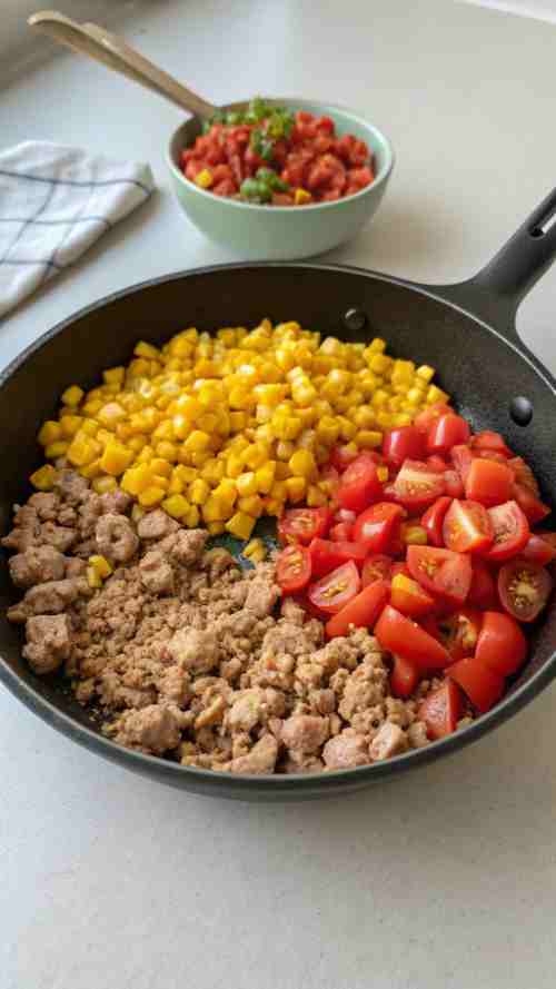 - Add the diced tomatoes, corn, and all your seasonings. Stir well and let it cook for about 10 minutes so all the flavors come together.