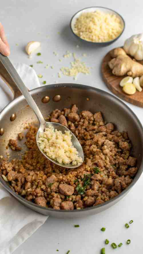 - Add minced garlic and grated ginger to the pan. Stir for about a minute until it smells amazing.
