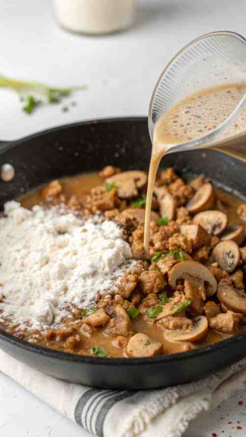 - Sprinkle flour on turkey. Stir 1 minute. Slowly pour in broth and Worcestershire. Toss in mushrooms if you like. Let it bubble 5–7 min to thicken.