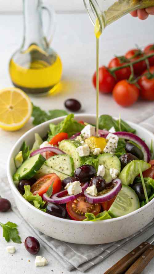 - Toss the lettuce, cucumber, tomato, onion, and olives in a big bowl.