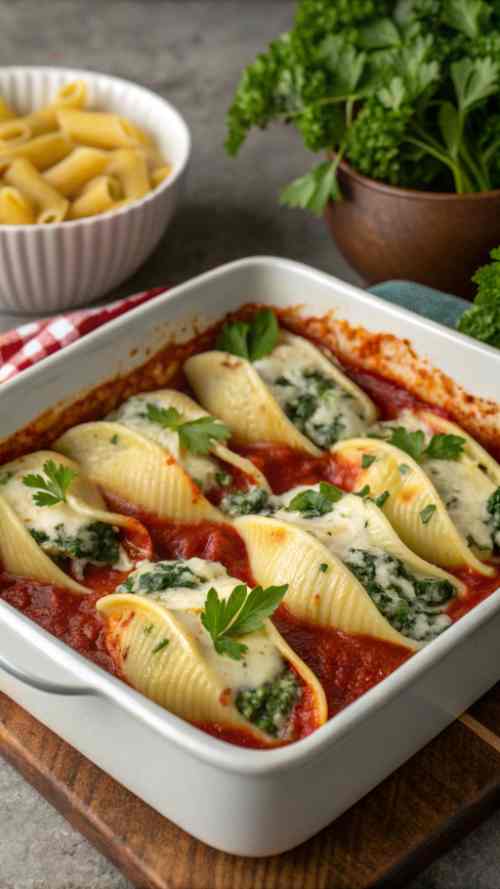 - Stuff each shell with about 2 tablespoons of the ricotta-spinach mixture and place them in the baking dish.