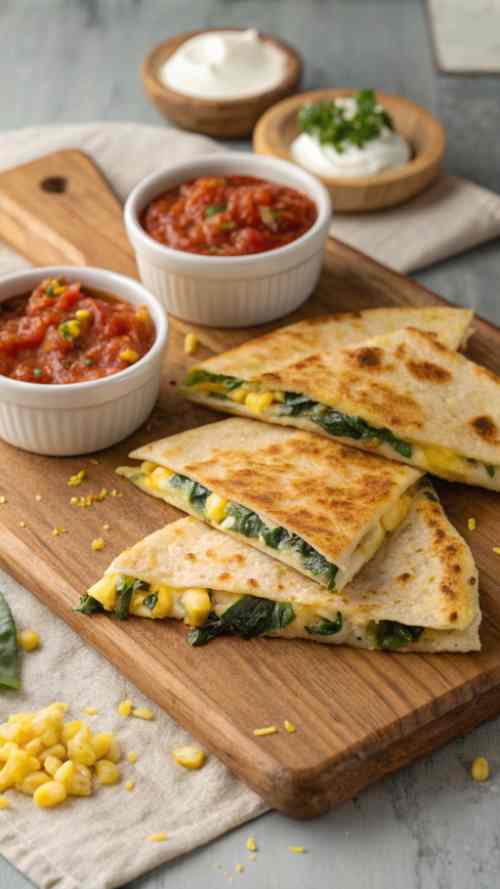Spinach corn quesadillas are a quick and cheesy snack perfect for busy afternoons. They’re crispy on the outside, gooey on the inside, and filled with healthy spinach and sweet corn. My kids love these with a dollop of sour cream or guacamole!